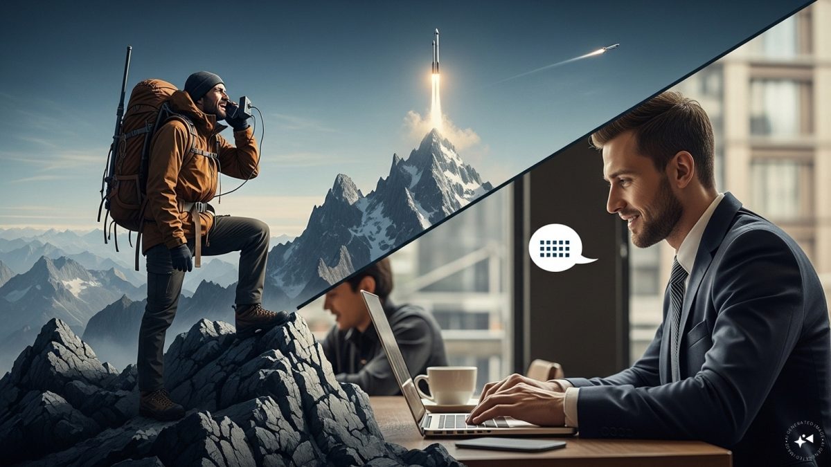 n this AI-generated representative image, a hiker on a mountain calls a friend at a downtown cafe using a technology that enables smooth calling across city streets and remote landscapes. (IMAGE: IMAGEN 4/News18)