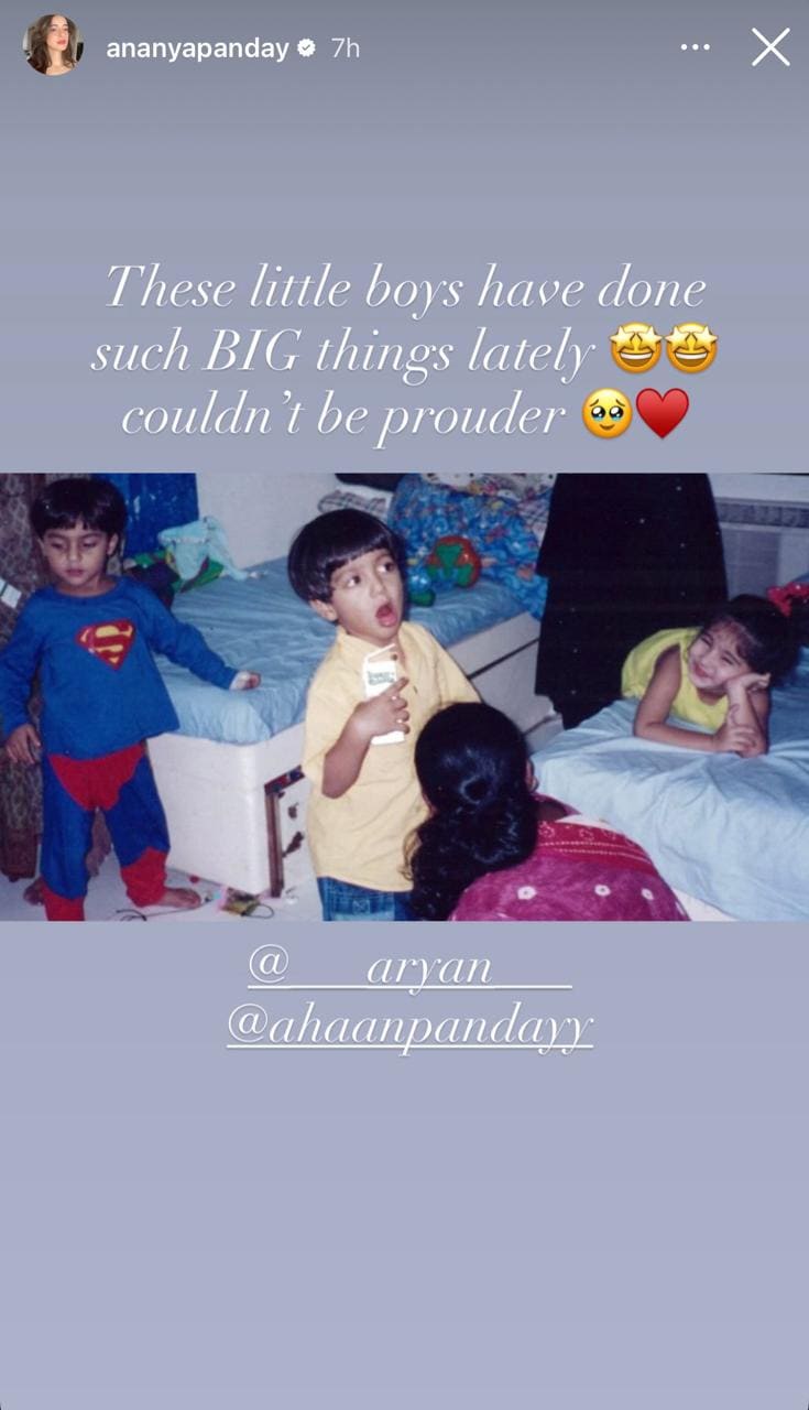 In the heartwarming snapshot, little Ahaan is seen animatedly holding something in his hand, while Aryan sports a Superman costume, and Ananya lounges on the bed with a bright smile. Alongside the nostalgic click, Ananya penned a sweet note that read: “These little boys have done such BIG things lately 😍😍 couldn’t be prouder 🥺❤️.” She tagged both Aryan and Ahaan in her story, underscoring her pride in their recent professional triumphs.