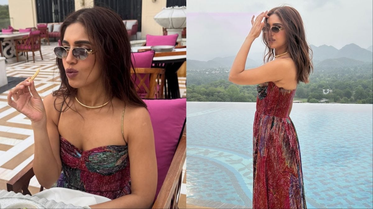 Bhumi Pednekar’s dreamy poolside look in a vibrant strapless gown is the perfect mix of glamour and ease.