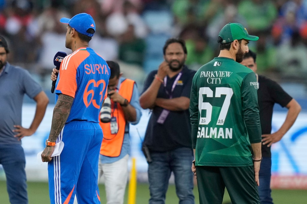 For the second time in the tournament, India’s Suryakumar Yadav and Pakistan’s Salman Ali Agha avoided shaking hands at the toss, breaking with tradition. Suryakumar returned to his team immediately after announcing his decision to field, leaving the moment enveloped in cold silence. (AP Photo/Altaf Qadri)