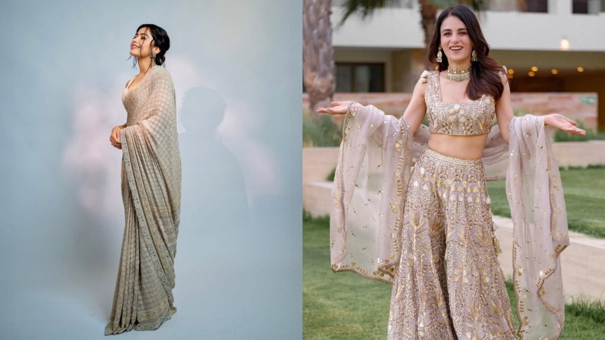 Wamiqa Gabbi: Channel Wamiqa Gabbi’s effortless charm in a grey saree-inspired ensemble. Pair it with dewy makeup for that soft glam look. (Image: Instagram)
