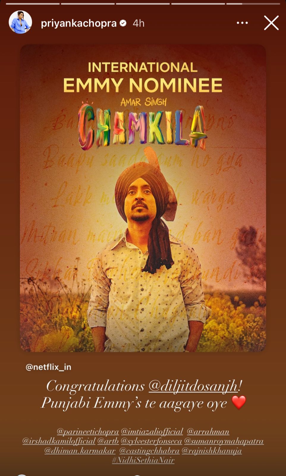 Diljit Dosanjh has been nominated for Best Performance by an Actor at the prestigious International Emmy Awards 2025 for his portrayal of the iconic Punjabi singer Amar Singh Chamkila. Now, Priyanka Chopra has expressed her pride in Diljit’s achievement by sharing her reaction on her Instagram Story.