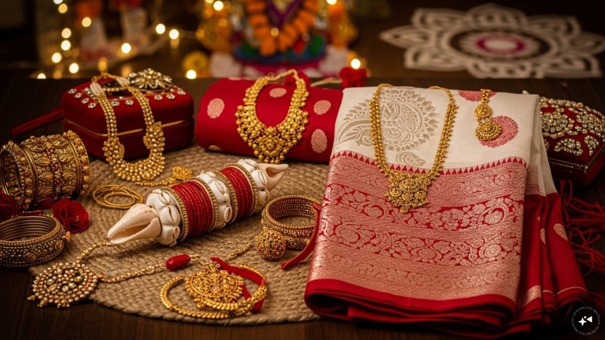 “Jewellery speaks its own language. Shakha-pola bangles click softly with every movement, gold chokers shimmer in the light, and silver earrings from college stalls remind many of youth. Mothers’ mangalsutras are worn differently for the season, and even a strand of jasmine tucked into hair serves as an ornament. Each piece quietly carries history, identity, and pride, echoing the past while embracing the present,” Subramaniam adds.
