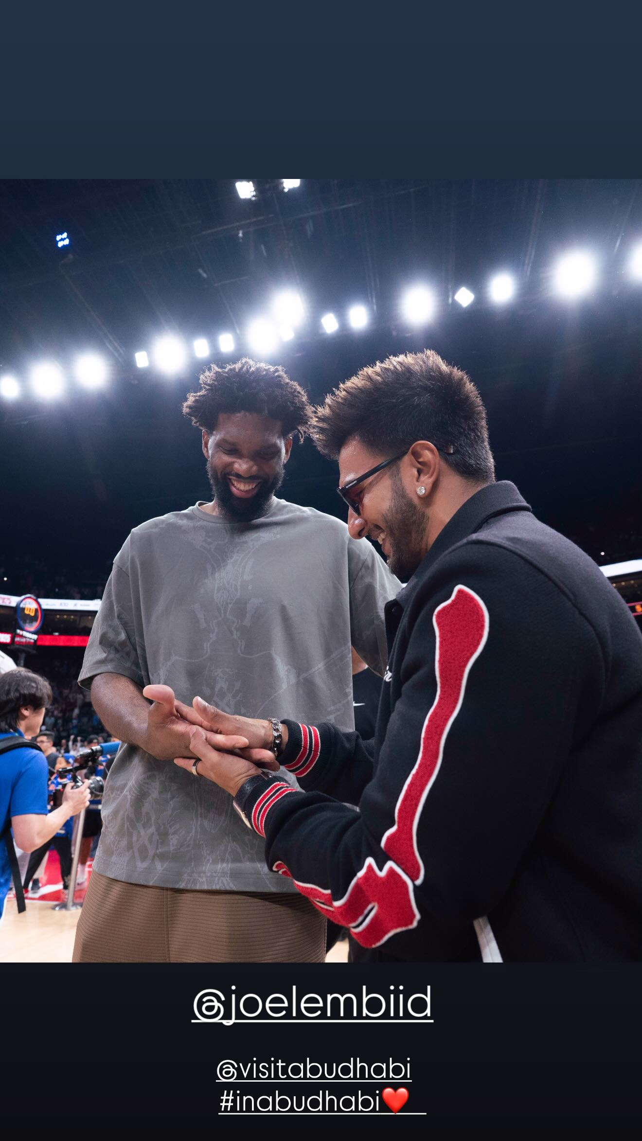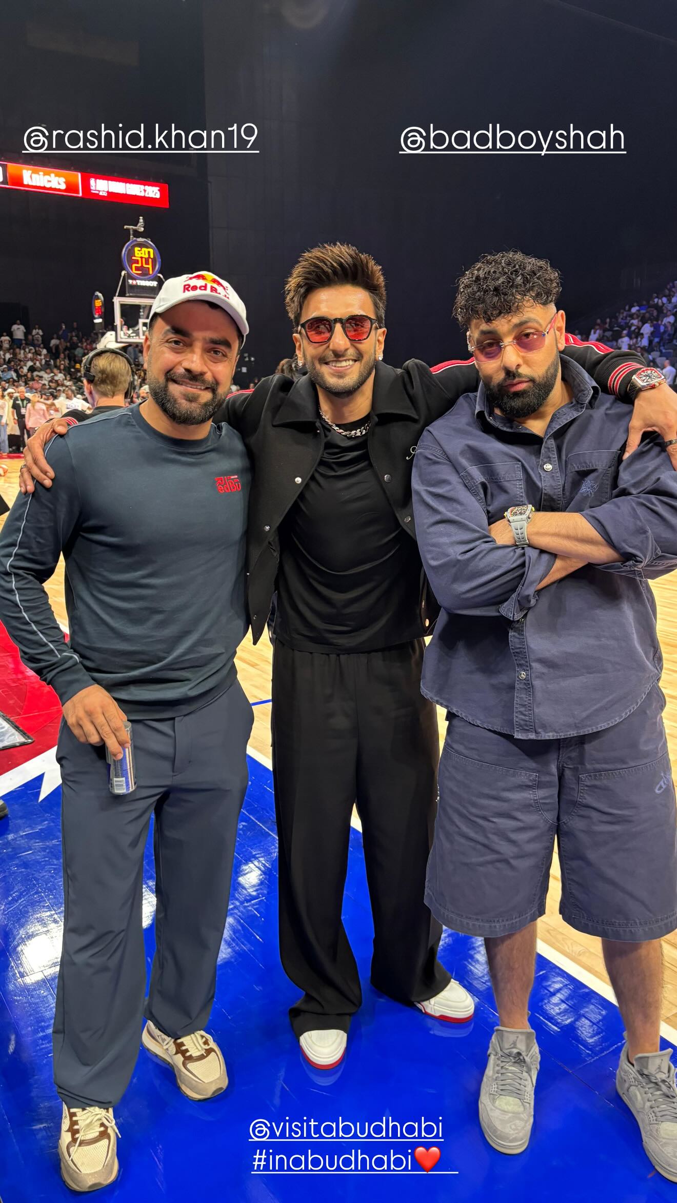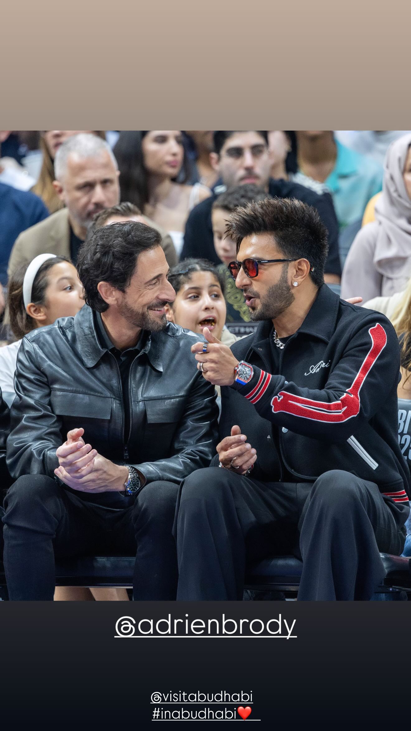 On Sunday, Ranveer Singh took to his Instagram stories to share several photos from the NBA pre-season game. One picture shows him happily interacting with Hollywood star Adrien Brody. Ranveer looked dapper in a black t-shirt layered with a matching jacket and pants. He rocked a new hairstyle, and accessorized with dark sunglasses. Meanwhile, another photo showed him sitting next to Victoria Justice, pointing at something that she was also looking at. Another photo showed him shaking hands with Joel Embiid. Ranveer was also seen posing with rapper Badshah and Afghan cricketer Rashid Khan.