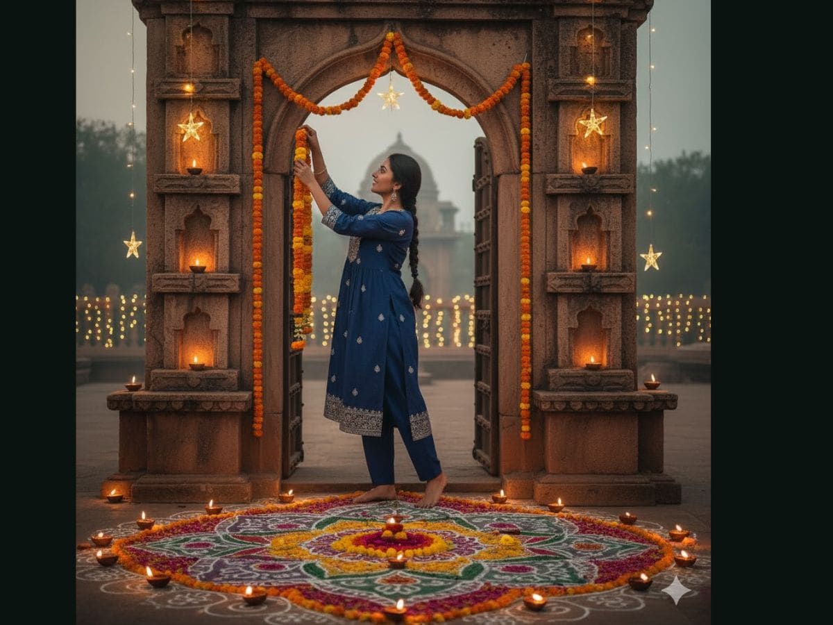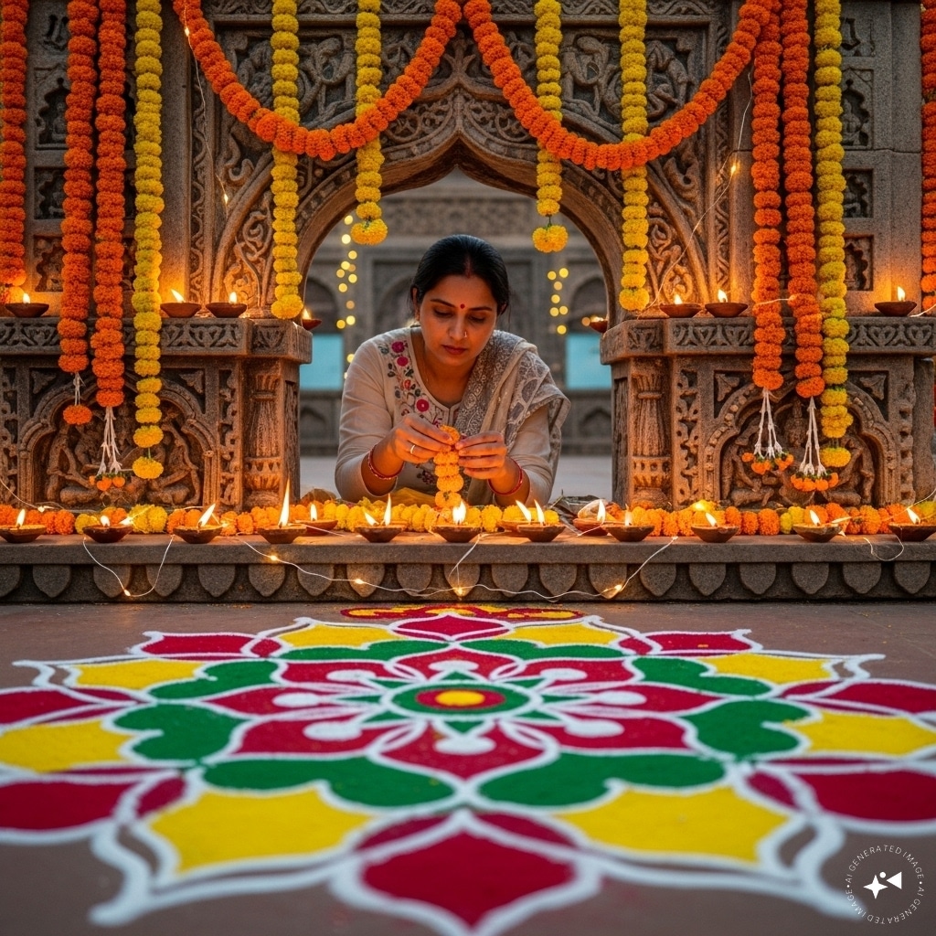 Festive Decorator: “A woman decorating a stone archway with marigolds and diyas, rangoli at her feet, and soft string lights enhancing the Diwali atmosphere.”