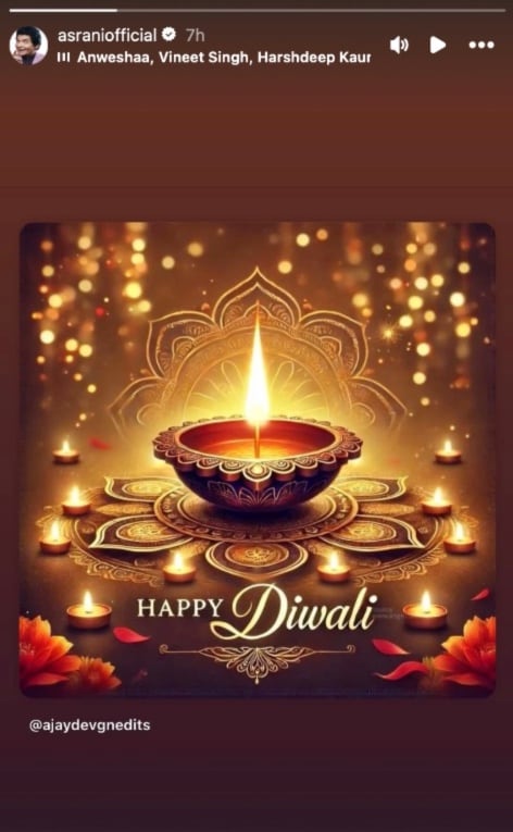Hours before his passing, veteran actor-director Govardhan Asrani, fondly known as Asrani, took to Instagram to wish his fans a Happy Diwali. Reposting an image of several diyas lit atop a rangoli with “Happy Diwali” written on it, his heartfelt gesture quickly became emotional for fans following him. The timing of the post, mere hours before his sudden demise, has left admirers and the film fraternity in shock.