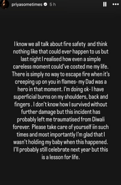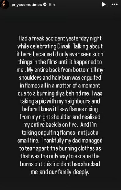Sharing the terrifying incident on Instagram on October 21, Priya wrote, “I was taking a pic with my neighbours and before I knew it I saw flames rising from my right shoulder and realised my entire back is on fire. And I’m talking engulfing flames- not just a small fire. Thankfully my dad managed to tear apart the burning clothes as that was the only way to escape the burns but this incident has shocked me and our family deeply.”