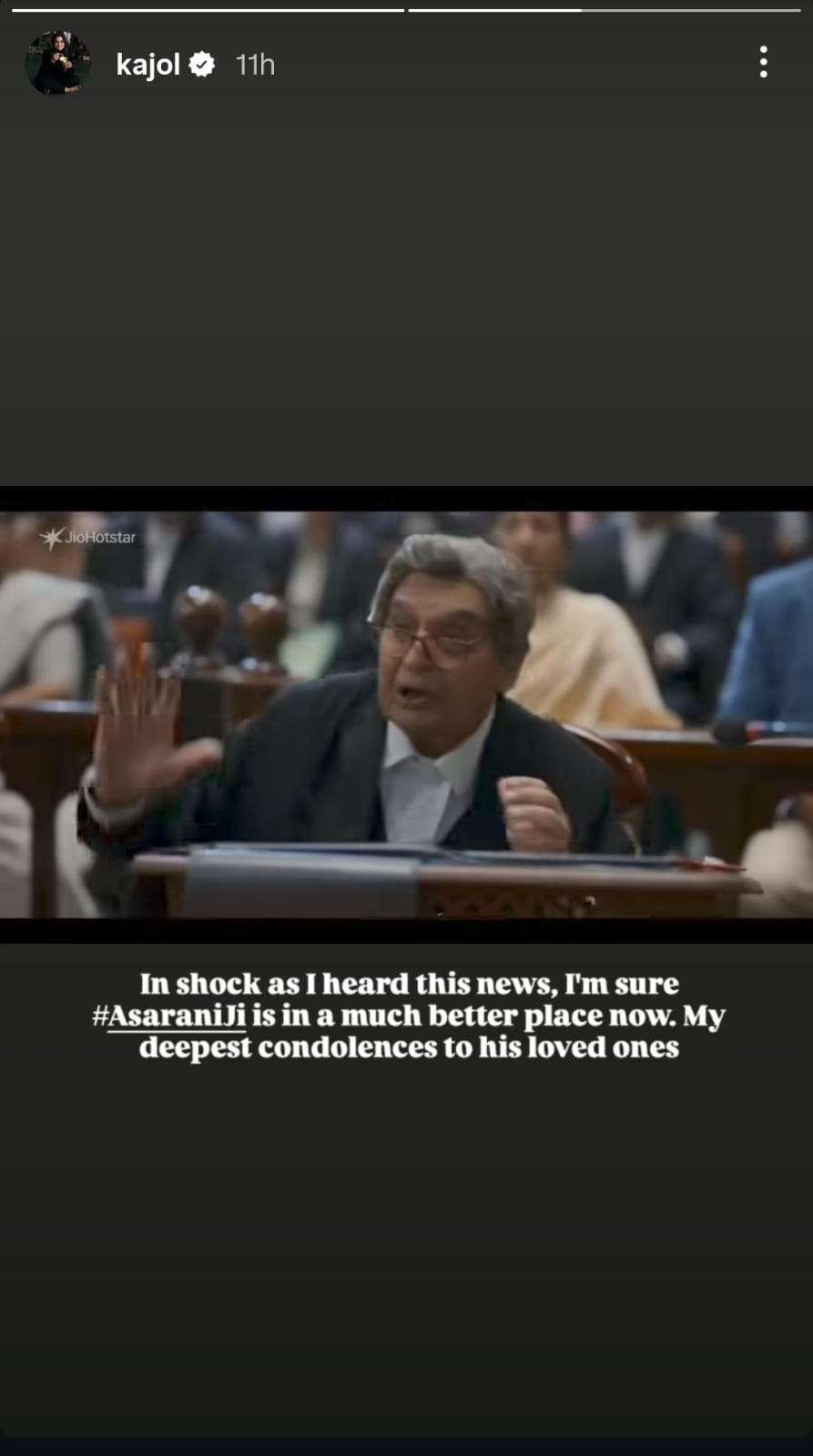 Kajol took to her Instagram stories to share a video clip from The Trial that features her and Asrani in a court. While Kajol was seen as Noyonika Sengupta in the series, Asrani played Navroz Electricwala. In her message, Kajol wrote, “In shock as I heard this news. I’m sure #Asrani Ji is in a much better place now. My deepest condolences to his loved ones.”