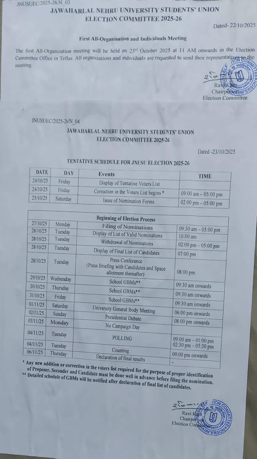 JNU gears up for its 2025-26 student union elections. The Election Committee has released the full timetable