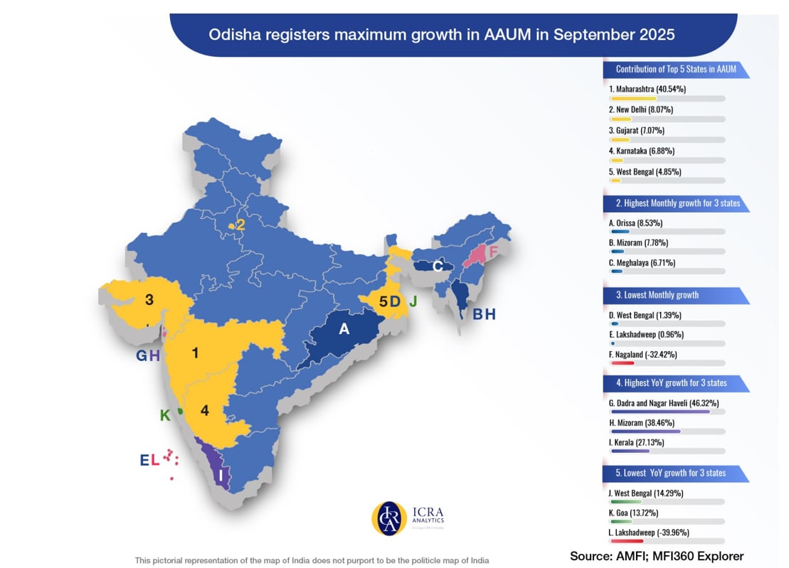 On a yearly basis, Dadra and Nagar Haveli witnessed the maximum growth in AAUM which stood at 46.32% followed by Mizoram which grew 38.46%. Barring Lakshwadeep, all states witnessed growth in AAUM on a yearly basis in Sep 2025, the minimum being that of Goa whose AAUM grew 13.72% YoY in Sep 2025. The AAUM contribution from Lakshwadeep fell 39.96% on YoY basis in Sep 2025.
