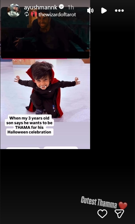 Taking to his Instagram stories, Ayushmann Khurrana shared a fan photo in which he is seen wearing a Thamma costume. The actor reacted saying, ‘Cutest Thamma’. Ayushmann Khurrana, who has been basking in the success of Thamma, seems overjoyed to see his character resonate even with the youngest fans.