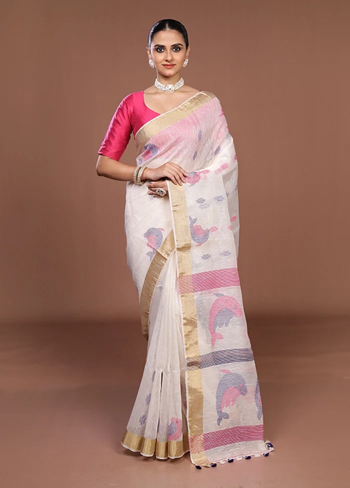 This white Jamdani cotton saree embodies that philosophy. Woven with pastel motifs that drift like watercolours across a misty canvas, it whispers of calm mornings and unhurried grace. From the ateliers of Indian Silk House Agencies, this piece distills the modern muse’s mood: serene, self-assured, and beautifully unembellished.