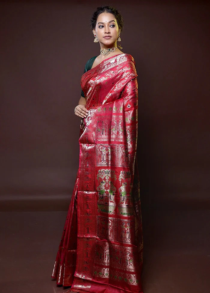 This red Baluchari silk saree, with its antique zari motifs and fluid drape, is a conversation between eras – the whisper of old looms meeting the pulse of the present. Each motif, a story from another time, shimmers anew under modern light. From the weaving studios of the Indian Silk House Agencies, this saree carries a heritage not preserved behind glass, but worn, lived, and loved again.