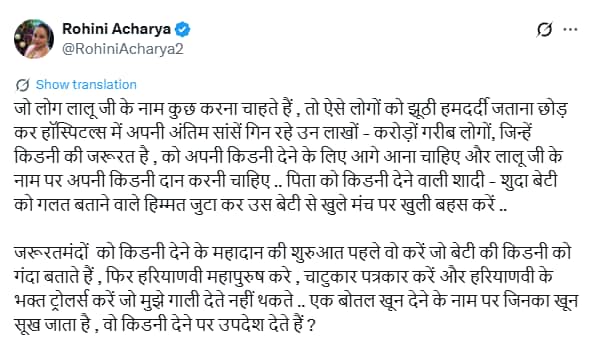 “Those people who want to do something in the name of Lalu Ji should stop pretending to show false sympathy and instead step forward to donate their kidneys to those millions—crores of poor people who are counting their last breaths in hospitals and need kidneys, and donate their kidneys in the name of Lalu Ji,” she said in a post on X.