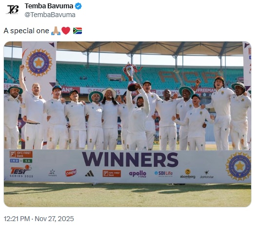 South Africa’s Test captain Temba Bavuma took to X and Instagram on Thursday (November 27) to share a picture of South African players posing for a photo with the winner’s trophy after defeating India in both the Tests of the two-match series. South Africa won the series opener under Bavuma’s leadership by 30 runs inside three days at Eden Gardens in Kolkata and then crushed the Rishabh Pant-led side by 408 runs in the second red-ball match played at Barsapara Cricket Stadium in Guwahati from November 22 to 26. The defeat by 408 runs in Guwahati is India’s biggest loss in Tests by run margin.