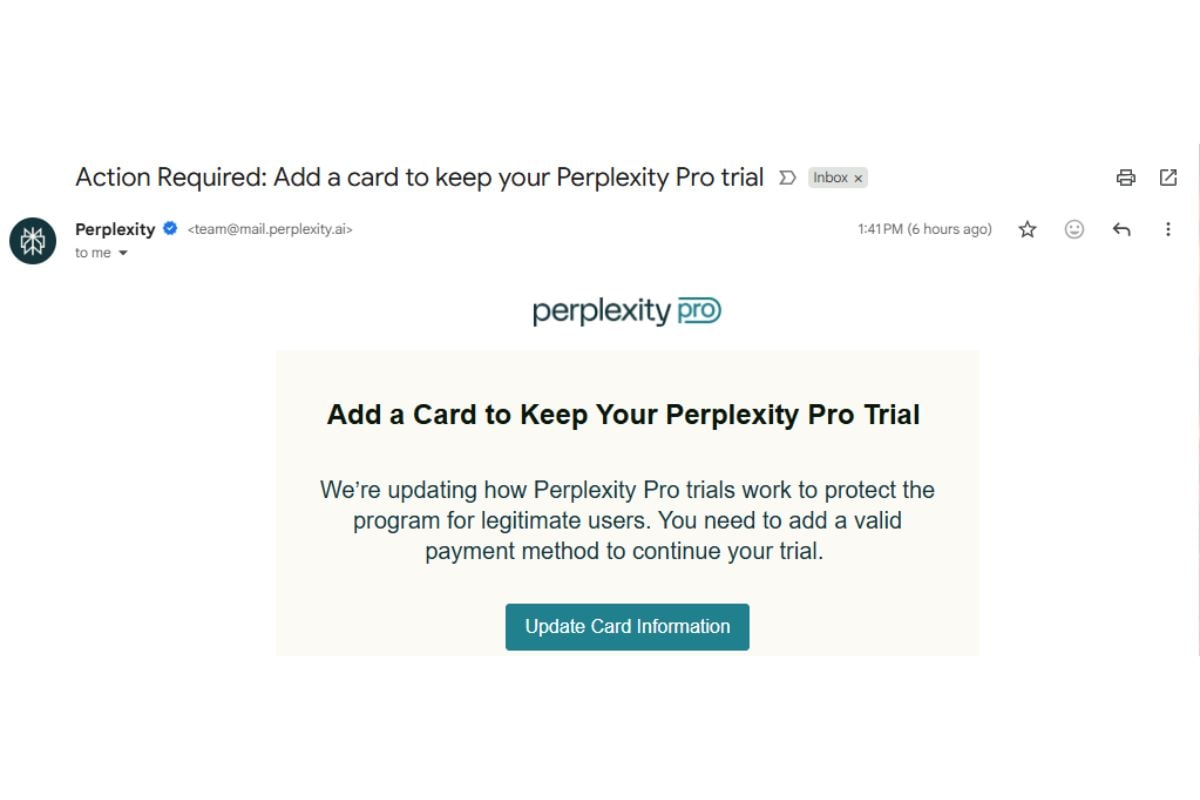 But the updated terms have been revised without telling the customers about the change, and just sending them a direct mail with a subject line, “Action Required: Add a card to keep your Perplexity Pro trial,” as you can see in the clip below.