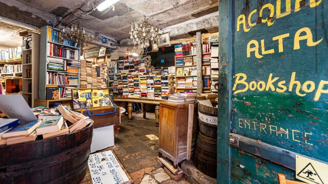 Libreria Acqua Alta, Venice | Founded in 2004, this Venetian bookstore protects its stock from flooding by storing books in bathtubs, plastic bins, boats and even a gondola. The result is a space that feels delightfully chaotic, where rising water has shaped both its layout and its legend. (Image source: Official website)