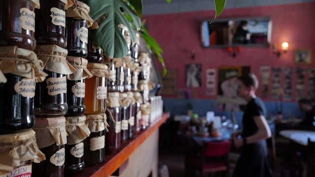Try out some of the homemade preserves, which sit on bar shelves. A waitress passes by a similar stock inside Szynk Praski restaurant. Image source: REUTERS/Kacper Pempel