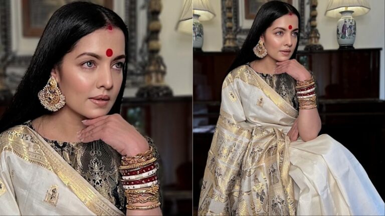 Last Updated:September 29, 2025, 17:42 IST For Shashthi, Celina Jaitly donned a Swarnachari saree that was gifted to her by…